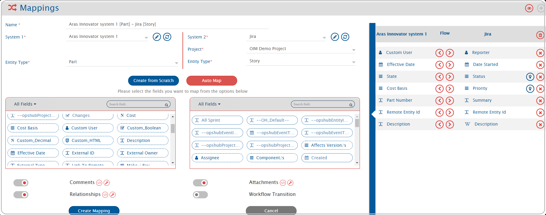 Map the fields between Aras Innovator and the other system to be integrated to ensure that the data between both the systems synchronize correctly. Check [Mapping Configuration](https://docs.opshub.com/v7.219/integrate/configure-integrations/mapping-configuration) to learn the step-by-step process to configure mapping between the systems.