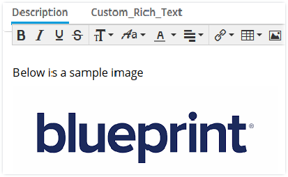 If an inline image is present in a rich text type of field in Blueprint, and the field is mapped as part of synchronization, then a tag describing the image code (e.g. `[Image = 664e7713-490d-e711-8145-12c125a2500f]`) will be visible in the target field (which is mapped corresponding to Blueprint Rich Text field) instead of the inline image.