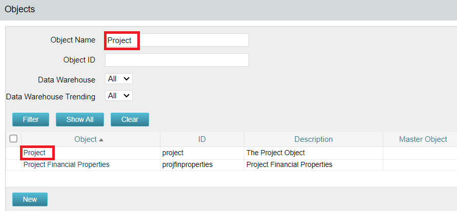 5. Search (e.g. `Project`) → Filter → Select desired entity.