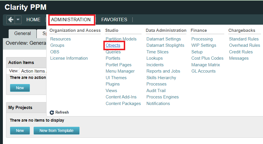 3. Click the **Administration** icon → Go to **Studio → Objects**.