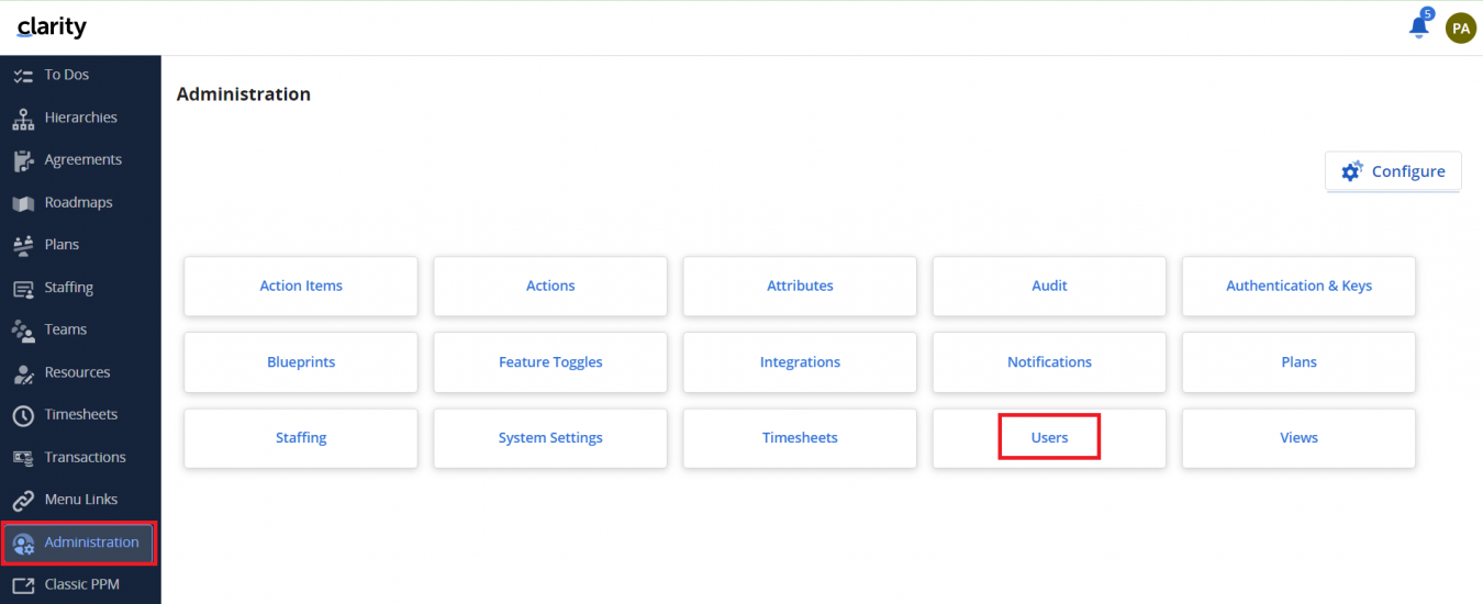 * Create a user in Clarity that is dedicated for <code class="expression">space.vars.SITENAME</code>. The user mustn't perform any other action from Clarity user interface. This user is referred as 'Integration User' in this documentation.