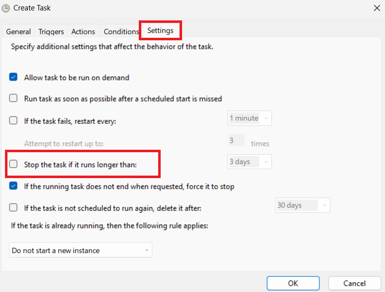 * In the Settings tab, disable the checkbox, "Stop the task if it runs longer than", as this will stop the OpsHubEAWindowsService if it runs longer than the specified duration.