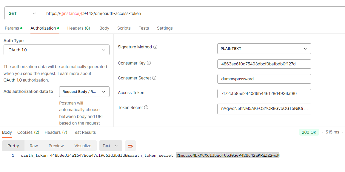 * In the response, OAuth token and OAuth token secret will be generated.