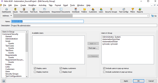 * User should not be used to create or update any entities from Helix ALM user interface. For help on how to add user, please refer [Add User](#add-user) in appendix. For help on how to assign user to groups, please refer [Assign User Privileges](#giving-user-privileges) in the appendix.