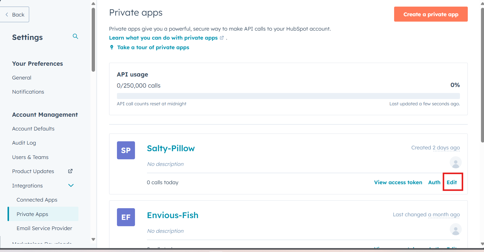 2. Go to **Settings → Account → Integrations → Private Apps**.