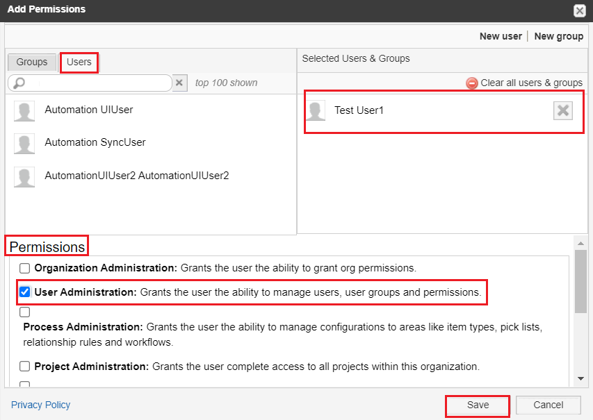 * Select **User Administration** from the "Permission" and save it as shown below: