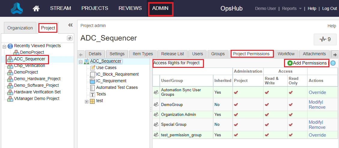 * Select **Add Permissions** in the **Access Rights for Project** as shown below: