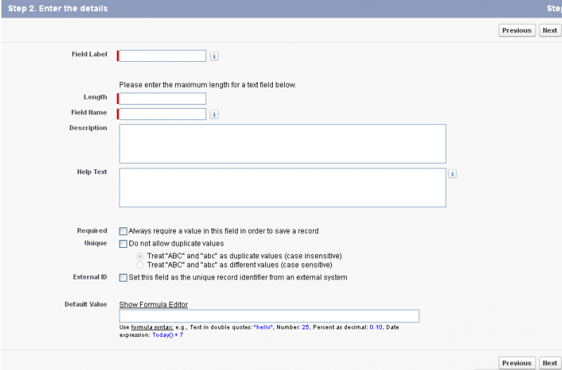* On next page, fill in all the field details. Keep Length to 255. Click **Next**.