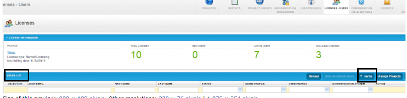 * Go to **License Users** tab and click **Invite** to send invitation to new user to be added.