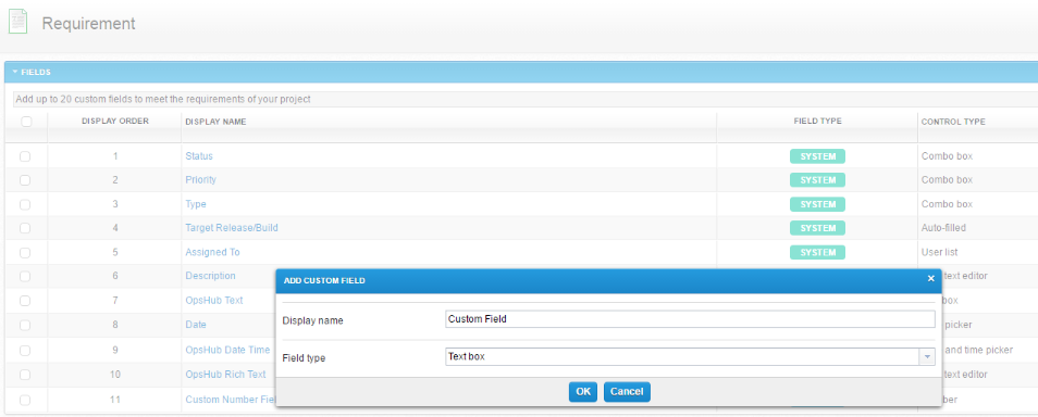 * In Field Settings, click the entity type to which custom field is to be added (Example: Requirement). Click on **Add Custom Field** button to add new custom field.