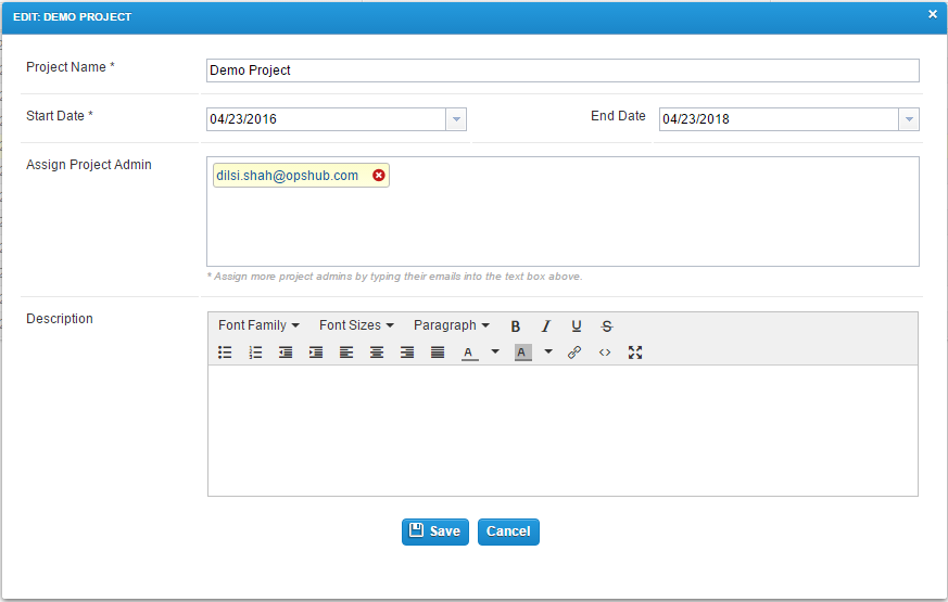 * Click on the project name in which user needs to be added and add user in **Assign Project Admin** field.