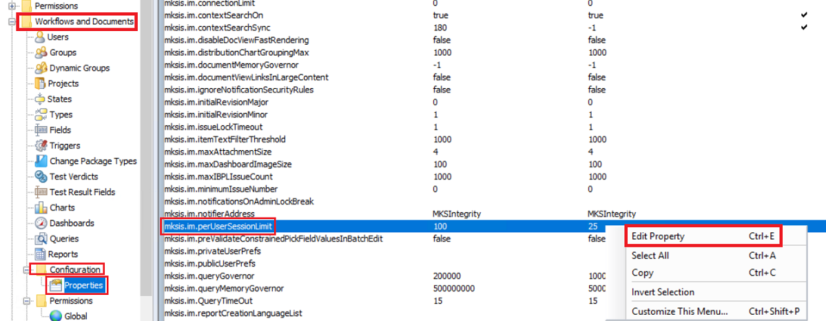 * On the Properties node, find the **mksis.im.perUserSessionLimit** property.