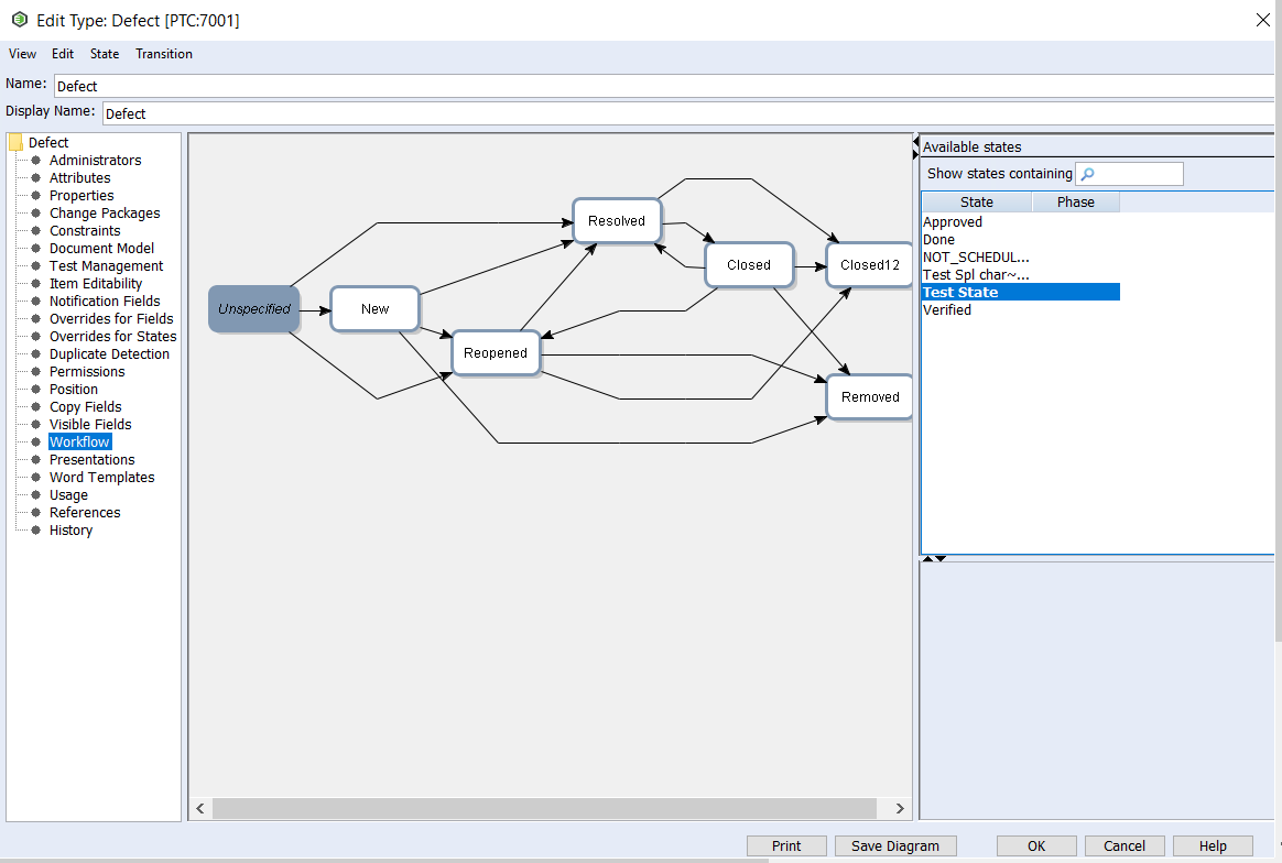 Workflow transition is applicable only when Windchill RV\&S is integrated as a target system. To understand the need for handling workflow transition in Windchill RV\&S, let us take an example: A `Defect` in Windchill RV\&S, when created should be in `New` state. It can then be moved to `Open` state and then to `Resolved` state, but it cannot be directly marked as `Resolved` from `New` state because of the state transition constraints enforced through Windchill RV\&S workflow configuration.
