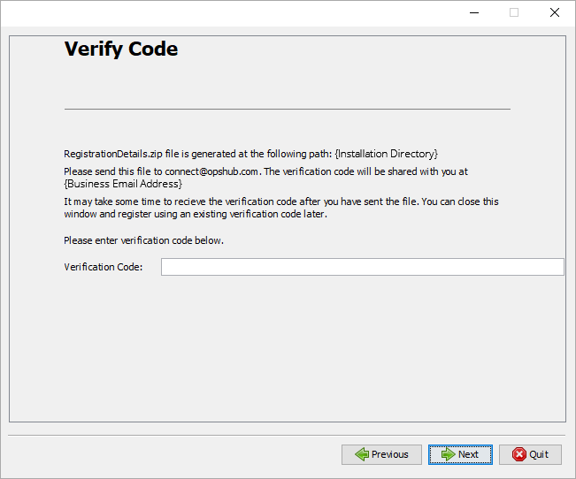 Send `RegistrationDetails.zip` on <CommunityManagers@opshub.com>. Verification Code will be then shared with you on your registered business email address.\