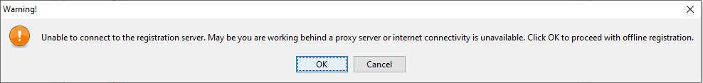 If the installer/migrator is not able to connect to the registration server, you will get an option to register yourself using **Offline Registration** option as shown below. Click **OK** to continue the Offline Registration.