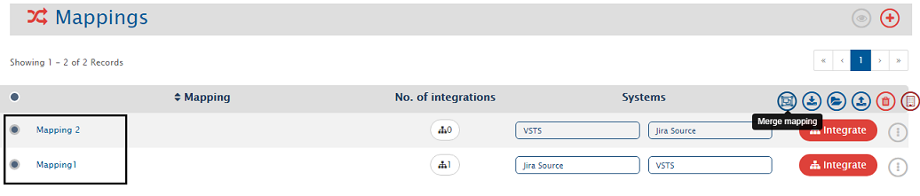 * Select merge option: On the Mappings list page, select 2 mappings. An option for merging those would be available as shown below.