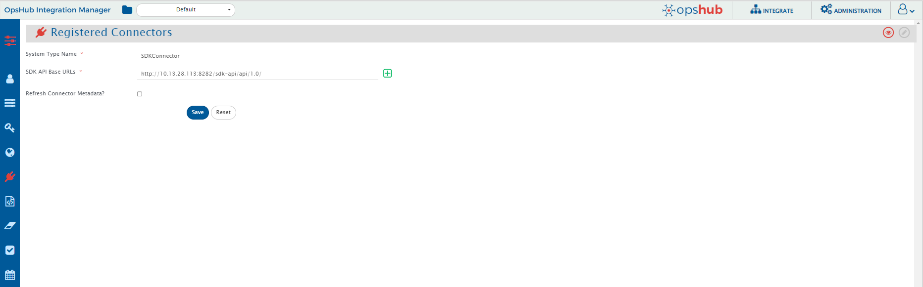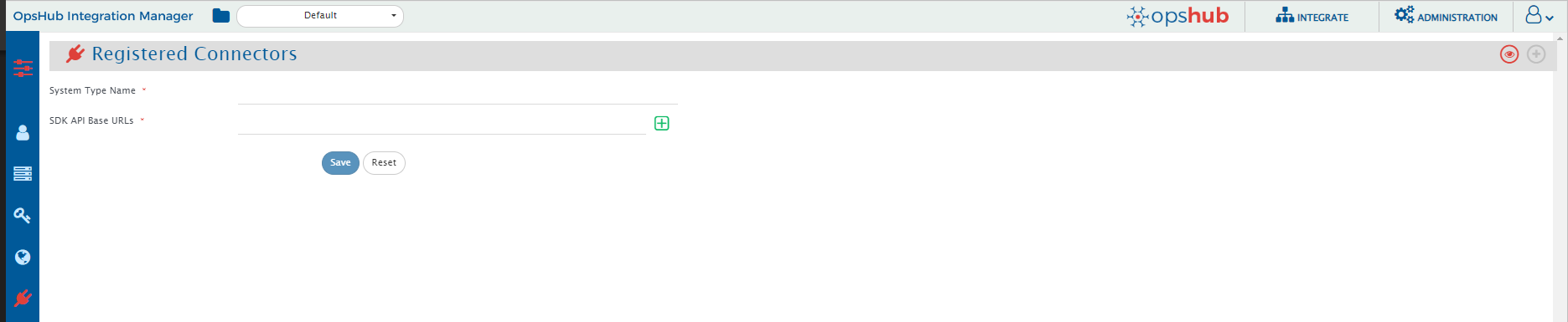 Connectors can be registered from the administration page by clicking the "plug" icon ![Register Connector Icon](https://3933757587-files.gitbook.io/~/files/v0/b/gitbook-x-prod.appspot.com/o/spaces%2Ffdz2palKrIftPEKa3Ard%2Fuploads%2Fgit-blob-4e49283d245e75032a7642932791433694fe4ae0%2FRegisterConnectorIconOnly.png?alt=media) present in the left sidebar as shown in the image below: