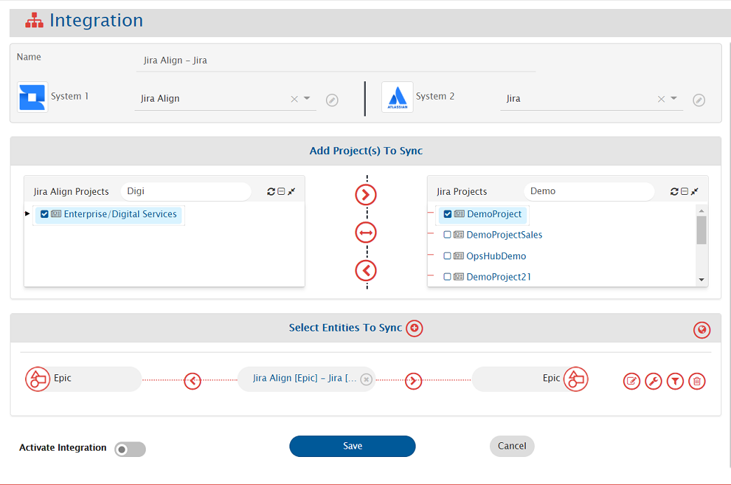 > In Jira Align, entity type selection in integration configuration depends on the project selection. To learn how, please refer: [Project Selection](#project-selection).