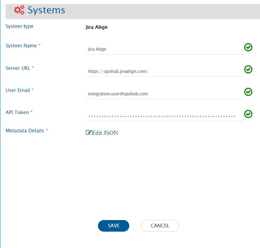 * The field metadata details needed for integrating Jira Align system with other systems are provided at the time of system configuration in the field 'Metadata details' in the form of JSON.