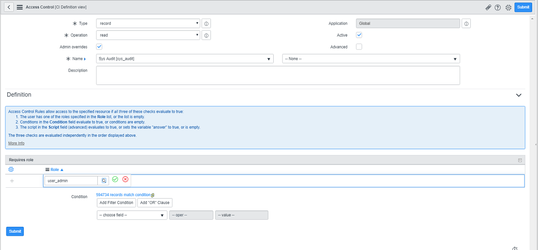 * You must have one of the roles in the required roles list associated with ACL. If the list is empty, this condition evaluates to 'true'.