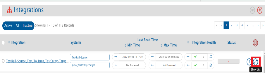 To view the logs for any integration, navigate to integration and click the **Show List** button. From the list, click the **View Log** button.