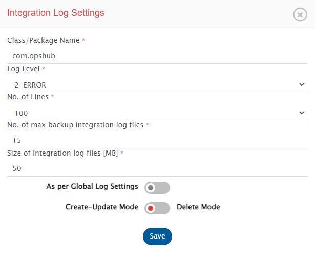 * **As per Global Log Settings Disabling:** The user-configured Integration Log Setting of Class/Package name, Log level, number of lines, and the maximum number of backup log files for the Create-Update/Delete mode of that integration will be used.