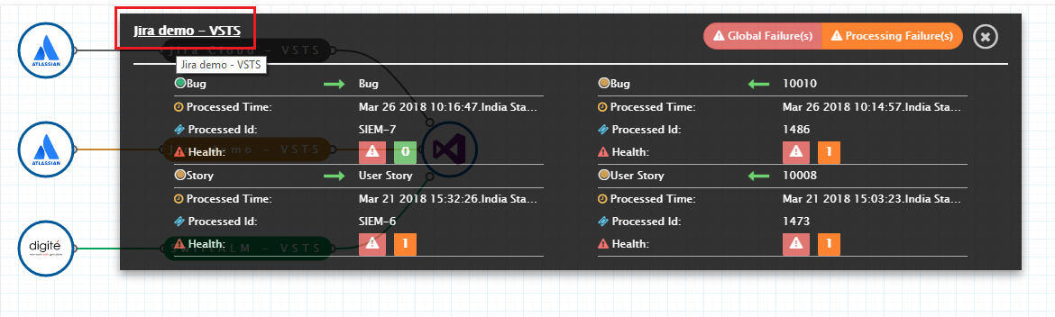 * **Health:** Shows failures, if any, logged in integration.
