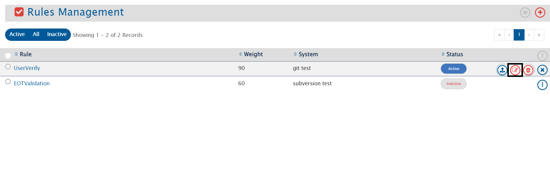 * **Activate/Inactivate rules**: Select the *Status* button against the rule for which you want to toggle the status. The status will change from *Active* to *Inactive* or from *Inactive* to *Active*