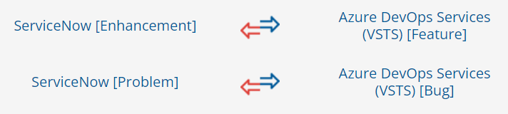 * Forward arrow (>) → data flows from ServiceNow to Azure DevOps Services (VSTS)